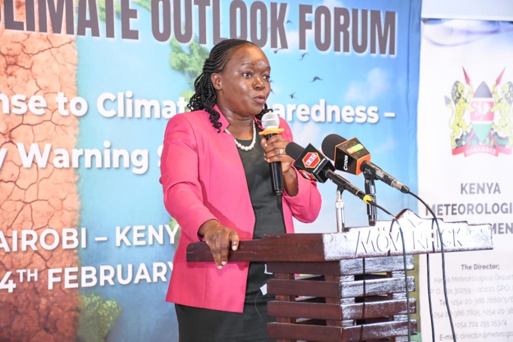 Caption : Cabinet Secretary for the Ministry of Environment, Climate Change and Forestry, Dr. Deborah Barasa presenting keynote remarks at the National Climate Outlook Forum